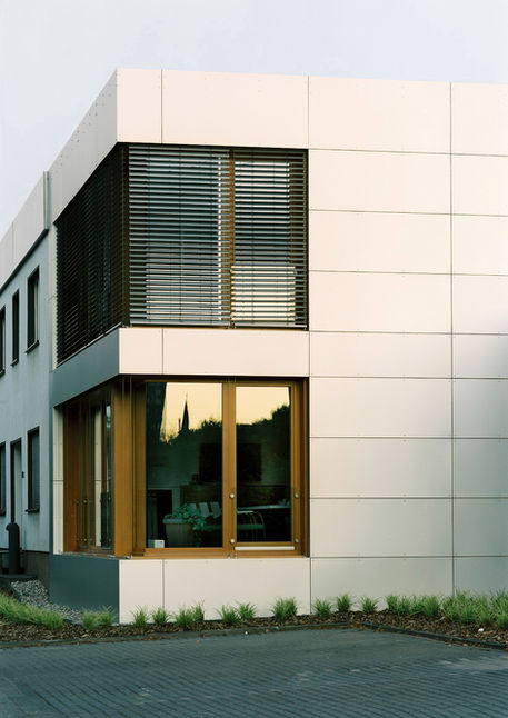 Ein zweigeschossiges Bürogebäude sollte profilgleich durch einen Neubau erweitert werden. Der Wunsch des Bauherrn war es ein möglich von weitem auffallendes und repräsentatives Gebäude zu erhalten. Der Neubau hat eine sichtbar geschraubte Aluminiumfassade, bodentiefe Holzfenster und eine stützenfreie Glasecke.